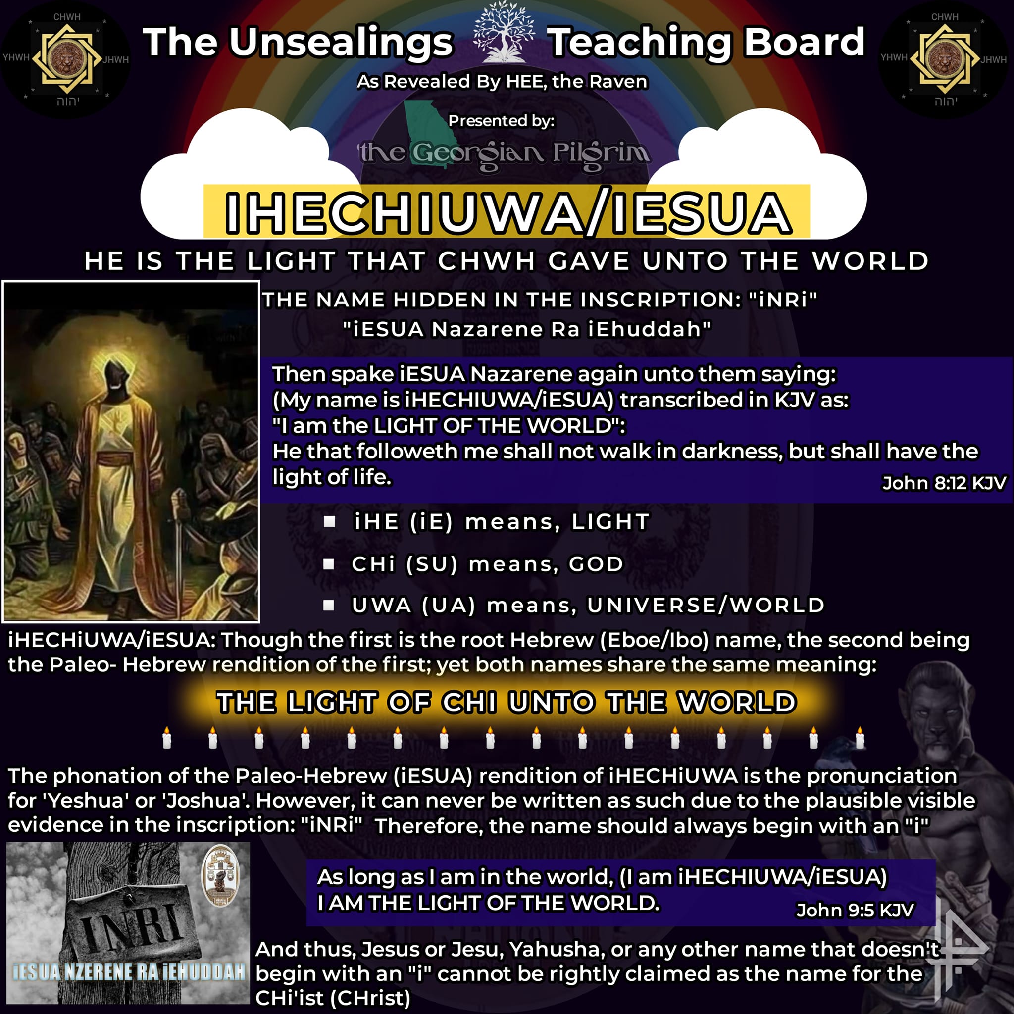 CHWH • YHWH • JHWHThe Unsealings Teaching Board CHWH as revealed by HEE, the RavenYHWH • JHWH • יהוה Presented by: יהוה the Georgian Pilgrim The Name iHECHIUWA / ¡ESUA HE IS THE LIGHT THAT CHWH GAVE UNTO THE WORLD …